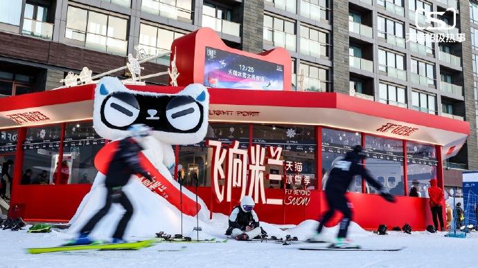 随着火种被点燃,同年12月的天猫冰雪季将冬奥热情进一步延展至真实的冰雪场景。在曾作为北京冬奥会赛场的崇礼云顶滑雪公园,天猫打造了“天猫飞行空港”慢闪空间,以鲜明的“飞向米兰”视觉意象,赋予每一次滑行以对2026盛会的向往。
