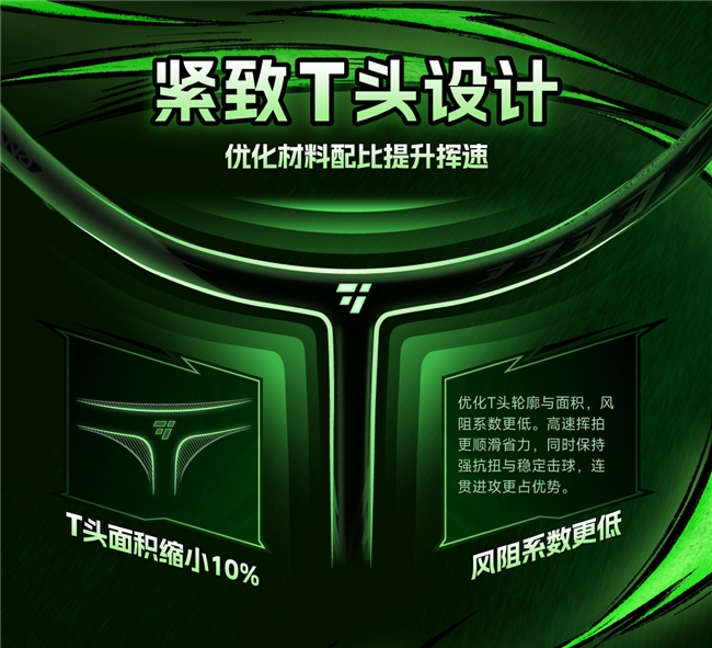 紧致T头设计。借由M46X的强悍性能,让T头区域可以使用更少的碳布堆叠来实现更优秀的抗扭表现。紧致纤细的T头造型,可以有效降低风阻,提升挥速。中前场的灵活度,由此获得新的释放。