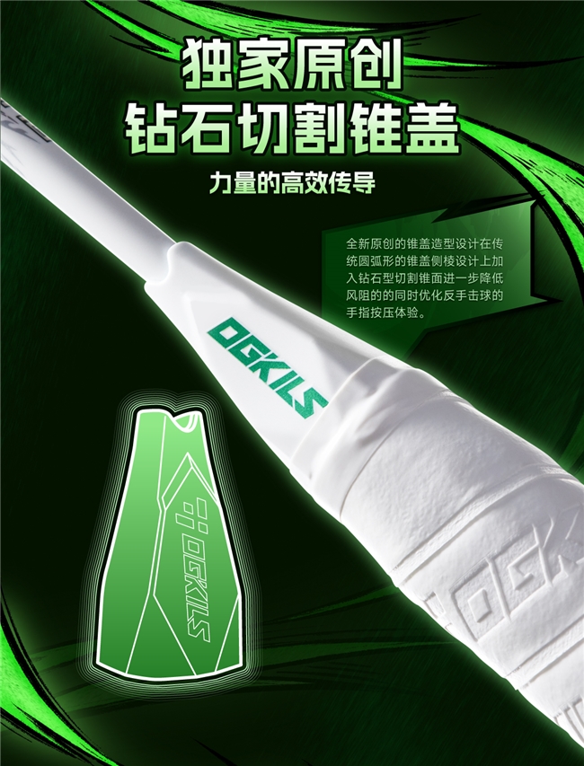 钻石切割锥盖。独家原创锥盖造型,在传统圆弧形锥盖侧棱设计上,加入钻石型切割锥面。进一步降低风阻,同时优化反手击球时的手指按压体验,力量从手掌到球拍的传递更加直接与高效,增加进攻亮眼表现。